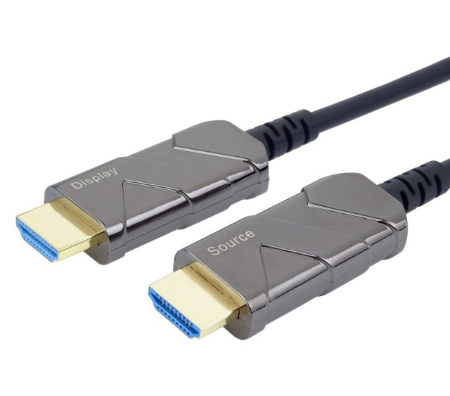 The optical Hybrid HDMI™ cable (fiber optic + copper) connects devices across long distances of up to 100 m without data loss – even in areas with high levels of electromagnetic radiation. Its particularly thin and light construction makes it perfectly suitable for all kinds of installations.