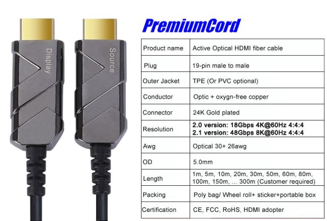 - HDMI 2.1 Ultra High Speed active optical fiber cable, supports HDMI2.1 or lower and HDMI2.0 and HDMI1.4
