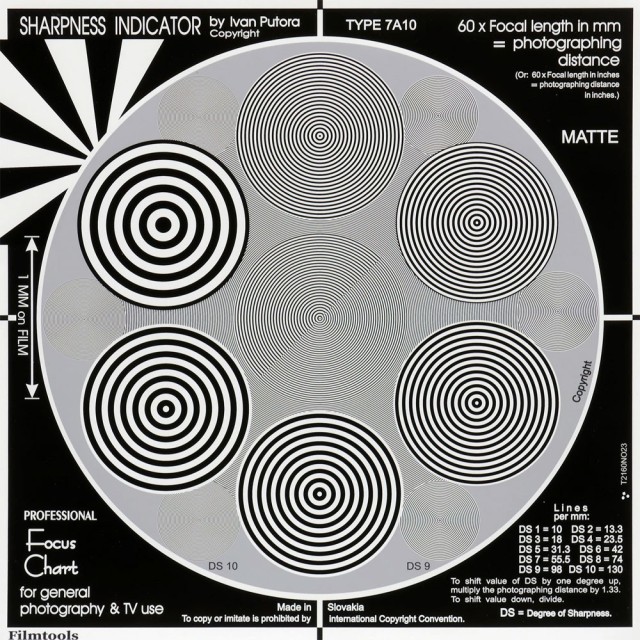 The new Putora 7A10 Sharpness Indicator model is the most advanced and accurate test chart available. Any photographer will be able to accurately evaluate the sharpness and resolution of all types of film, video and camera. The sharpness indicator consists of test targets with concentric circles printed on the background at the level of the reference field. The background has the same reflectivity as the average reflectivity of the targets. When the target appears to blend into the background, the table shows that the target is out of focus of the system under test.