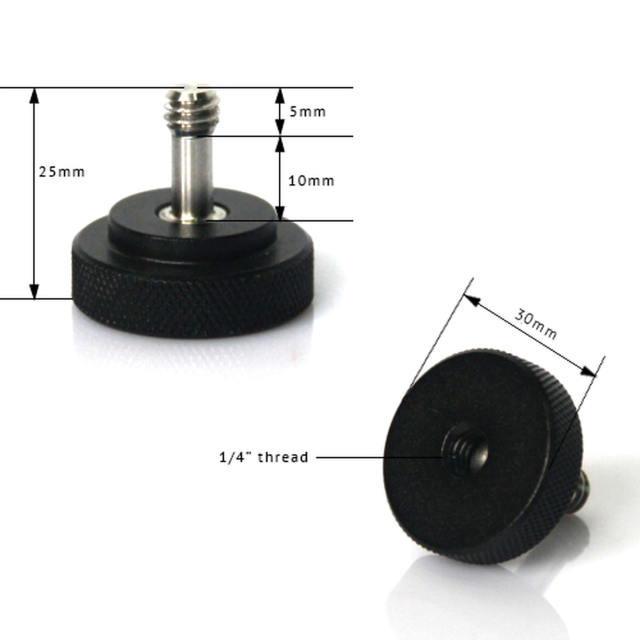 Quick release thumb screw with 1/4 inch thread works with our tripod mounting plate as follows: Made of All aluminum alloy. Also a 1/4" thread on the bottom. Material: aluminum alloy