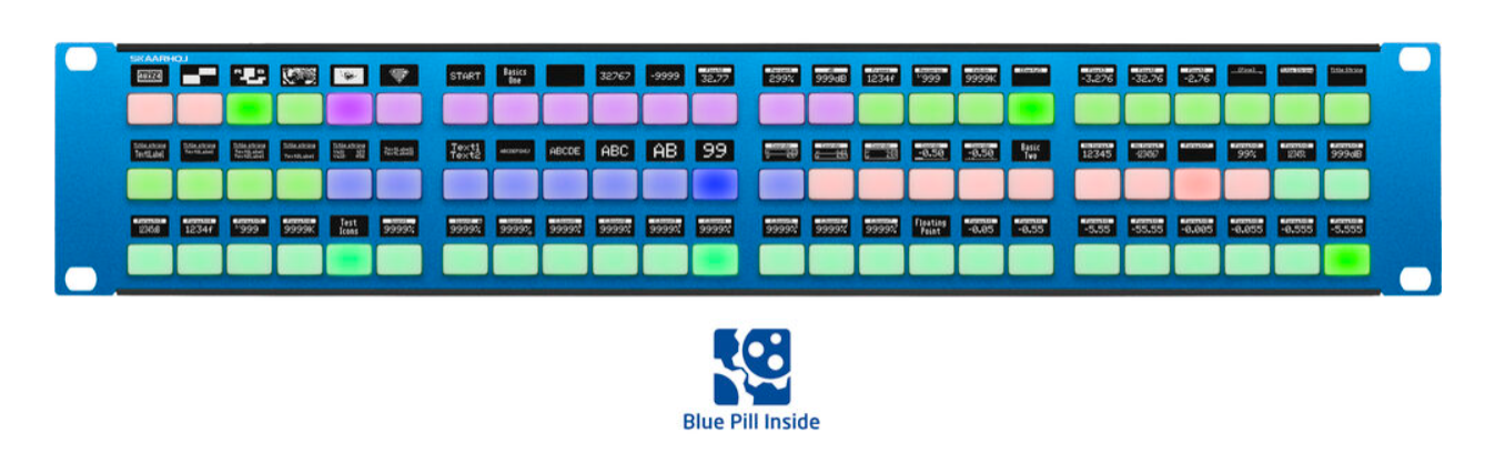 The SKAARHOJ Rack Fly Trio with Blue Pill Inside is a compact 2RU rack-mounted broadcast control surface featuring 72 programmable four-way buttons with RGB lighting and OLED displays, designed for flexible and scalable live production workflows.