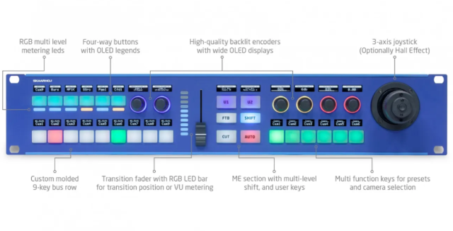 The SKAARHOJ Rack Fusion Live with NKK, Hall Effect Joystick and Blue Pill Inside is a high-end modular rack control surface designed for professional broadcast, live production, and multi-camera environments. Built on SKAARHOJ’s Blue Pill Inside architecture, it replaces traditional external configuration systems with integrated processing, enabling flexible and scalable control of ATEM, vMix, TriCaster, Livestream Studio, and a wide range of IP PTZ camera systems.