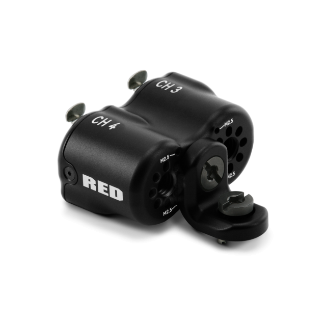 The DSMC3™ RED® 5-Pin to Dual XLR Adapter is a compact solution to break out the 5-Pin ODU port to Dual 3-Pin XLR ports. The Adapter can provide 48V phantom power with mic and line input and is easily mounted to your V-RAPTOR® via ⅜-16 screw.