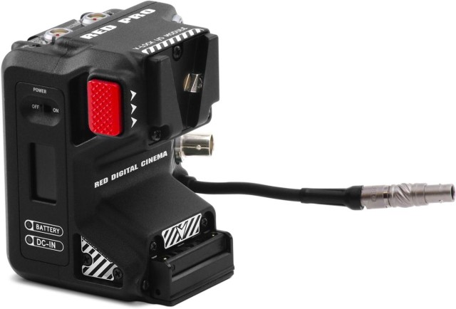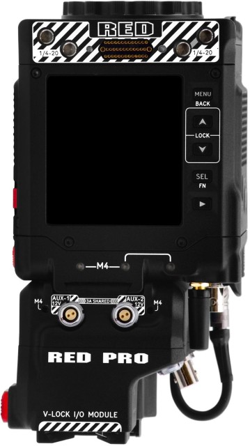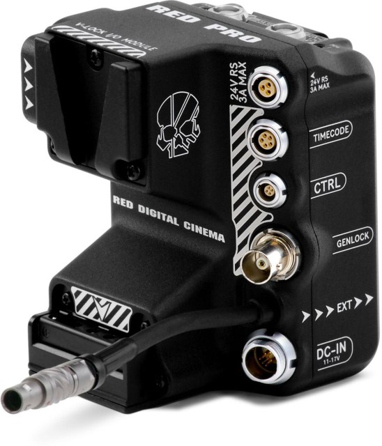 The RED Pro I/O V-Lock Module offers a variety of Input/ Output connections, as well as an industry standard V-Lock mount to power your Komodo-X with higher capacity batteries. This module mounts directly to the Komodo-X’s rear Micro V-Lock plate, 9-Pin Ext Port and offers connections for the following:
