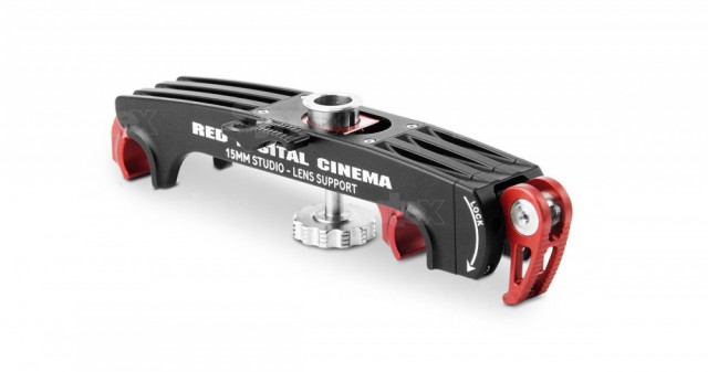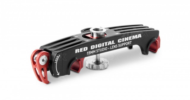 The RED LENS SUPPORT 15MM (OFFSET) slides onto your offset studio 15mm rail system to support longer, heavier lenses. This product uses a 1/4"-20 tie-down thumbscrew and a 3/8"-16 reducer in order to accommodate all available lens configurations, without the need for tools. The center locking support allows horizontal travel of 2.5mm and vertical travel of 3.5mm for quick adjustments when mounting to your lens. Even with a matte box and follow focus attached, you will be able to attach and remove your lens support without interfering with your configuration. Also available in 15MM (LIGHTWEIGHT) and 19MM. Compatibility: WEAPON, EPIC, SCARLET.