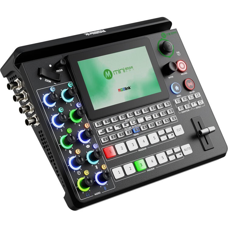 The mini-edge SDI features a built-in 5.5" full-color HD display for real-time monitoring of inputs, preview, and program outputs. Its tactile control surface includes illuminated buttons, knobs, a joystick, and a T-bar fader for fast, precise switching. Integrated PTZ control via VISCA and NDI|HX3 allows direct pan, tilt, zoom, and focus control of up to four cameras directly from the switcher, with joystick-based operation and preset recall.