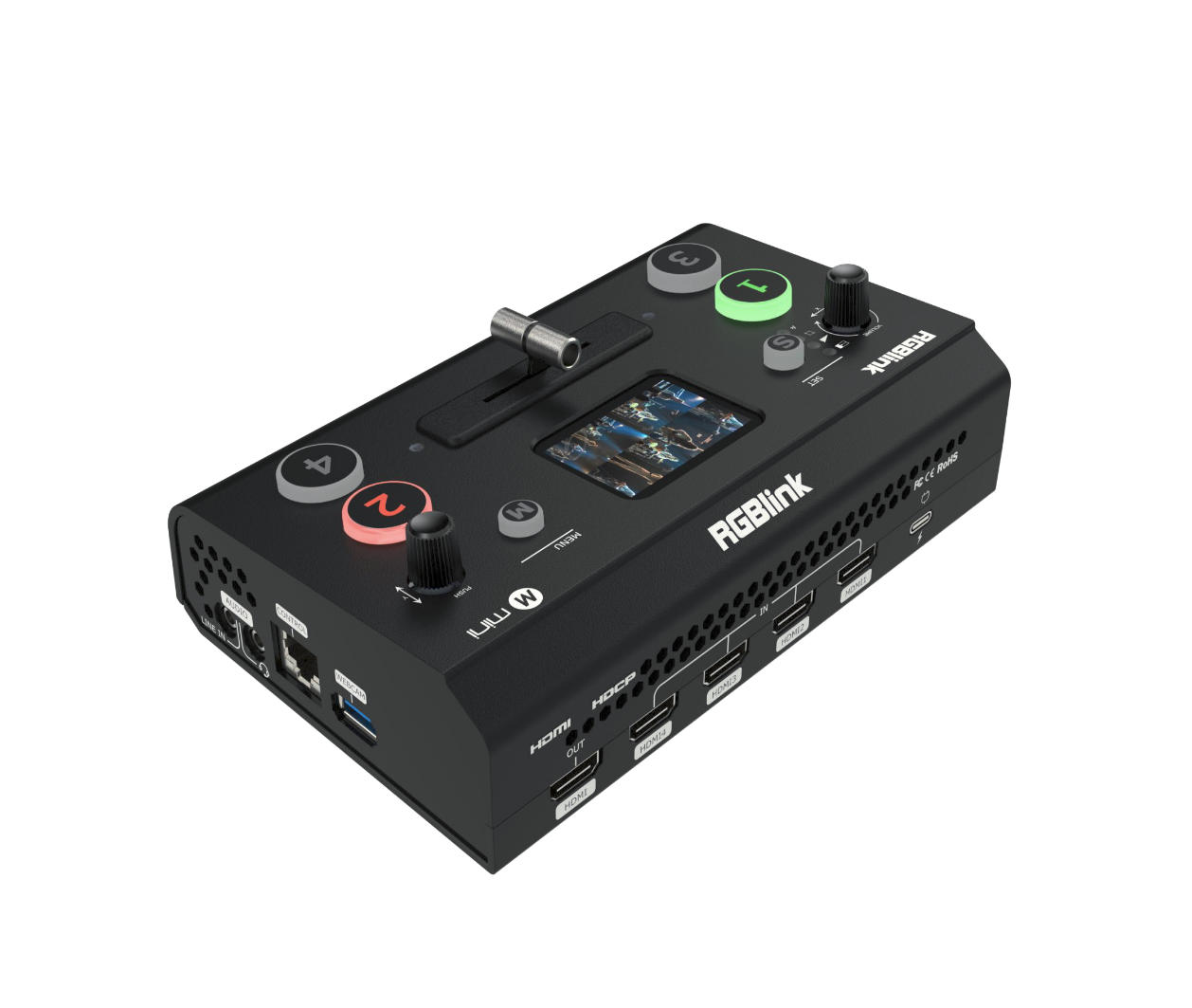 The RGBlink mini 2022 is a compact and portable live video switcher designed for small to mid-scale productions, offering four HDMI inputs, professional audio mixing, multi-view monitoring, and USB streaming. With its built-in 2.1-inch full-color screen, T-Bar switching, and support for PIP/PBP layouts, it delivers powerful production capabilities in an easy-to-carry integrated design.