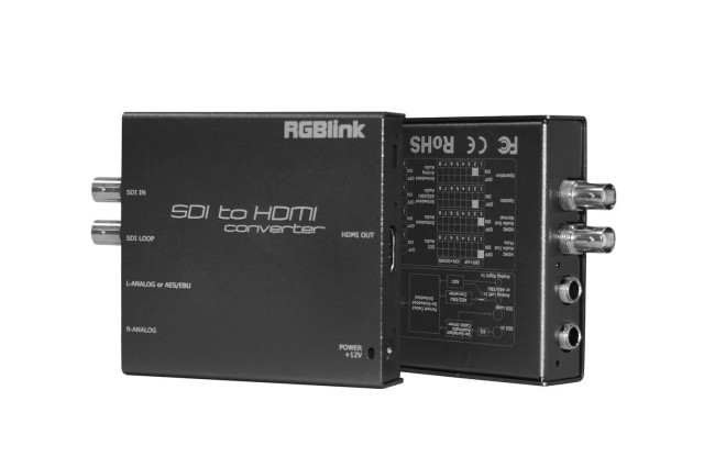 The RGBlink MSP 203 is a high-performance SDI to HDMI converter designed for professional AV, broadcast, and video production applications. It supports SDI inputs up to 3G-SDI and converts them to HDMI output while embedding stereo audio via two 1/4-inch analog inputs or a digital AES/EBU signal. A loop-through SDI output allows monitoring or daisy-chaining multiple devices.