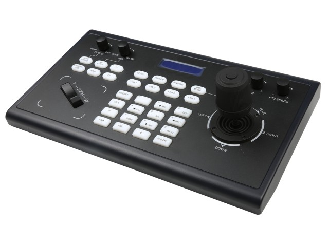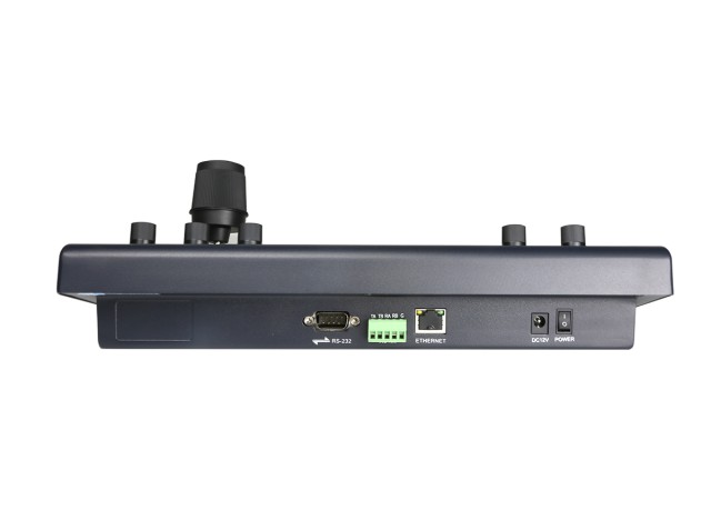 The RGBlink PTZ Camera Controller allows you to control up to 255 cameras via Ethernet and serial connections. ONVIF, VISCA, Pelco-D, and Pelco-P protocols are supported. A joystick, knobs, and key controls allow the user to quickly switch between PTZ cameras and adjust the parameters. An LCD screen with a key tone is present on the front panel.