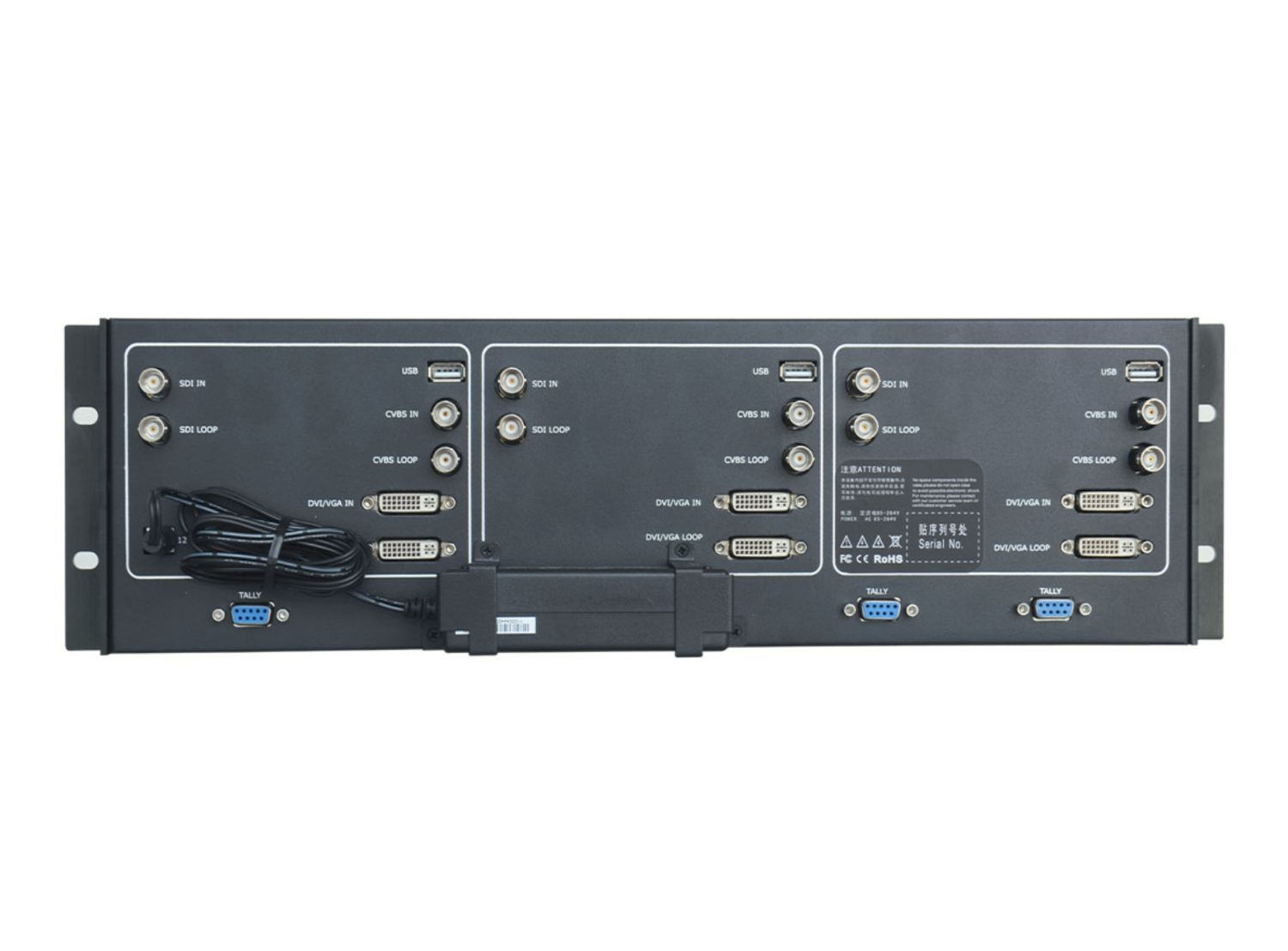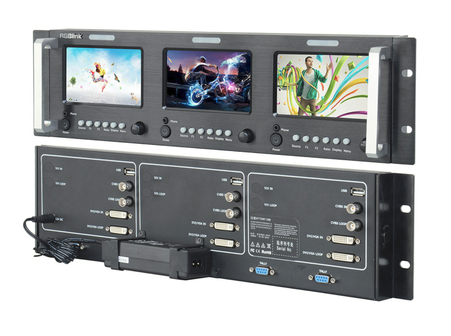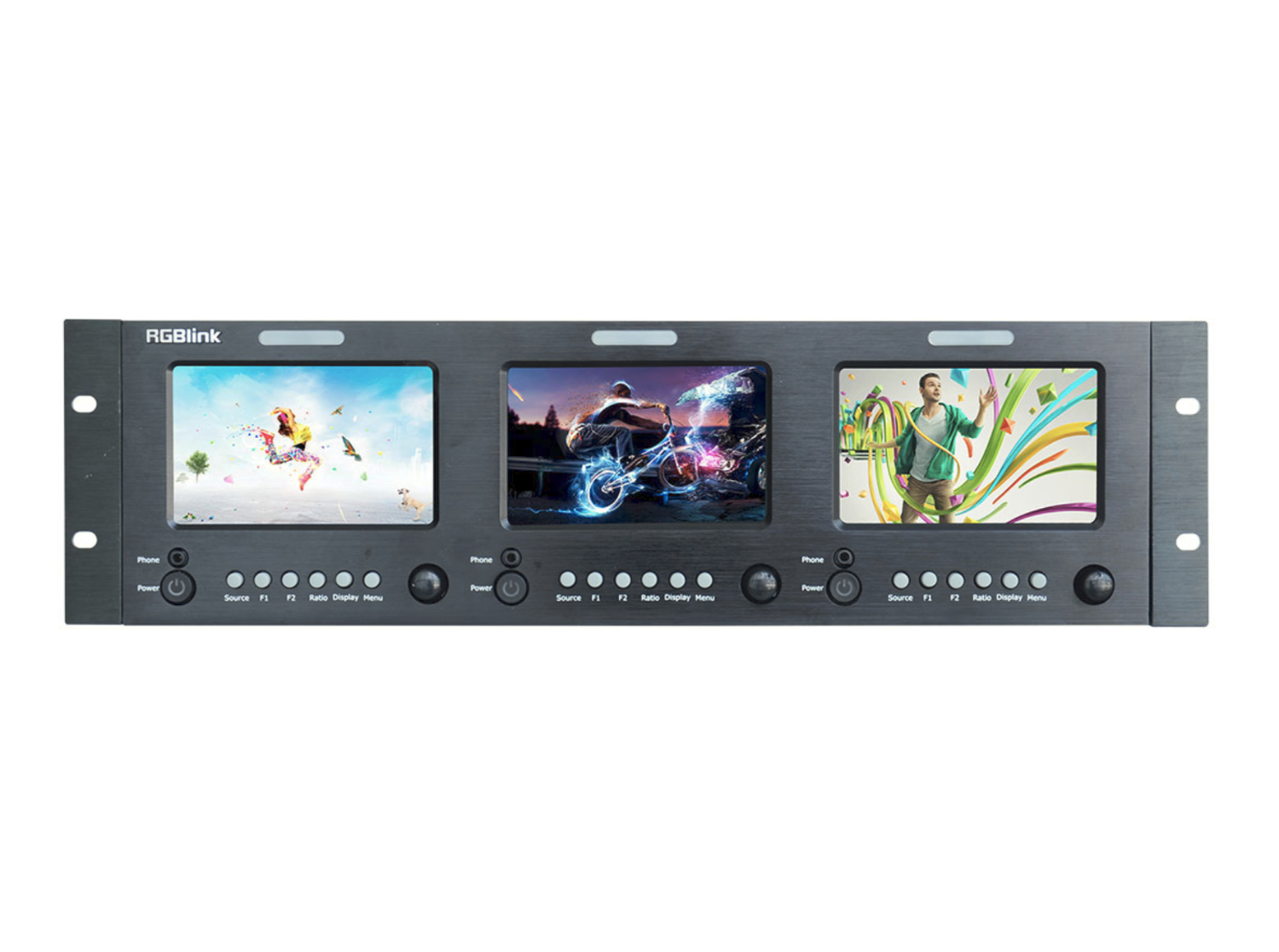 The RGBlink RMS 5533S is a compact 3RU rack-mount monitor featuring three independent 5-inch LCD displays with multi-format video input support, tally indicators, and embedded audio monitoring, making it ideal for broadcast racks, control rooms, and OB van applications.