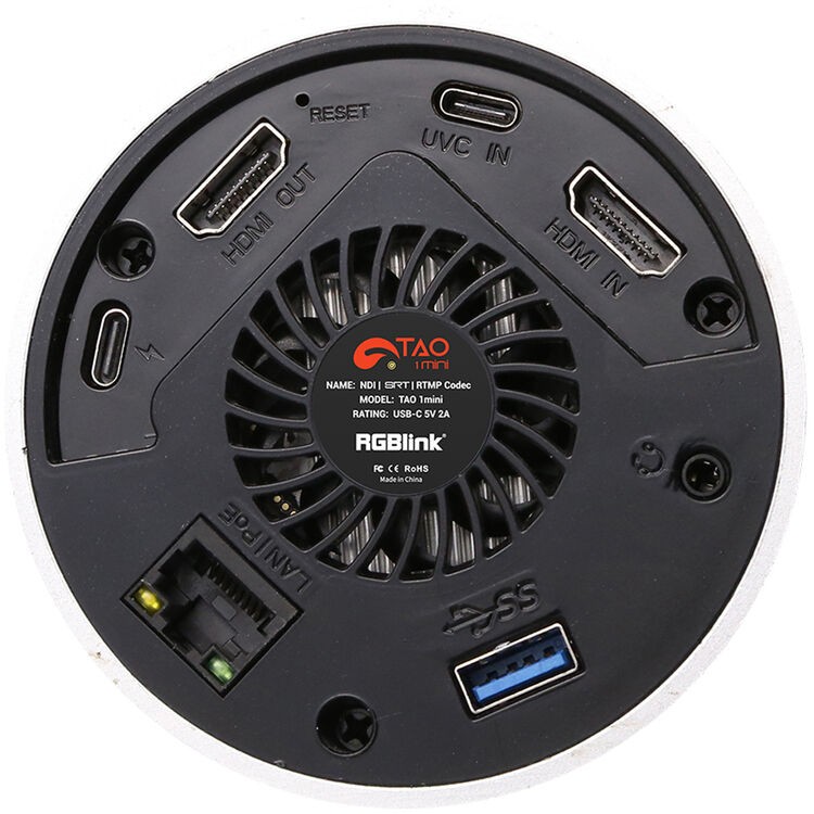 The RGBlink TAO 1mini is a professional-grade 4K streaming, encoding, decoding, and recording device built into an ultra-compact circular design. Featuring a 2.1" color touchscreen with LED tally lights, the TAO 1mini allows direct monitoring and control of streaming and encoding operations without the need for a computer. It supports HDMI and USB-C UVC video inputs up to DCI 4K60, making it compatible with PTZ cameras, DSLRs, webcams, and computers.