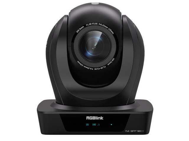 The RGBlink 4K Vue PTZ camera with 20x optical zoom is a high-performance camera with stable AI tracking, 4K@60 resolution, versatile output options and advanced features such as dual microphones and PoE+, making it ideal for a variety of professional applications.