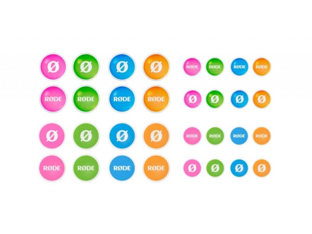 COLORS 3 is a set of four color pop microphone filters, cable identification rings, labels and sticker sets for RODE Wireless GO, Wireless GO II and Lavalier II to make channel identification in multi-microphone setups easier.