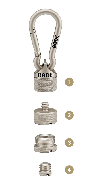 The Thread Adaptor is a premium universal adaptor kit for mounting a range of devices onto any mic stand, boompole, tripod or studio arm. It features 1/4, 3/8, and 5/8 inch adaptors in a unique integrated set with a carabiner for safekeeping. These can be configured to connect any standard thread to any standard mount – a lifesaver on set, in the studio, or in the field – and it features a handy driver for tightening and loosening the adaptors.