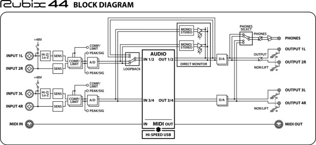 Highly dynamic sources like percussion instruments often need level taming with dynamics processing. It’s also common to apply compression on vocals and bass while tracking to even out levels and make these sources easier to mix. Rubix44 is equipped with panel-accessible compressor/limiters on inputs 1/2 and 3/4, ensuring good, hot signals without clipping and unwanted distortion. The dynamics processing is completely analog, providing smooth and transparent control with zero added latency.