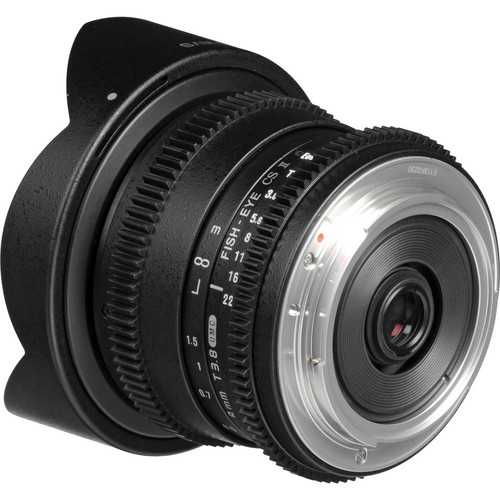 The aperture ranges from T3.8 to T22. T3.8 being its fastest aperture, this lens is best used in environments with sufficient light or with a light source incorporated. The aperture is manually adjustable without click stops with a continuous, smooth aperture ring. Both the aperture ring and focus ring feature a 0.8 gear pitch in case you want to use a follow focus with either. The focus ring is also well-damped and very smooth. The lens doesn't offer auto-focus, but in fish-eye lenses objects appear mostly in focus anyway. The minimum focusing distance is 11.8" (30 cm).