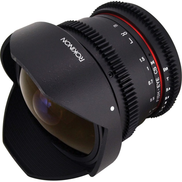 This Canon EF Mount Samyang 8mm T3.8 UMC Fish-Eye CS II Lens is a fish-eye cine lens designed for video capture on cameras with APS-C sized sensors. It features an 8mm focal length and a 180° ultra wide angle of view. This angle of view changes, however, to 167° on Canon cameras because Canon APS-C sized sensors are slightly smaller and have a crop factor of 1.6.