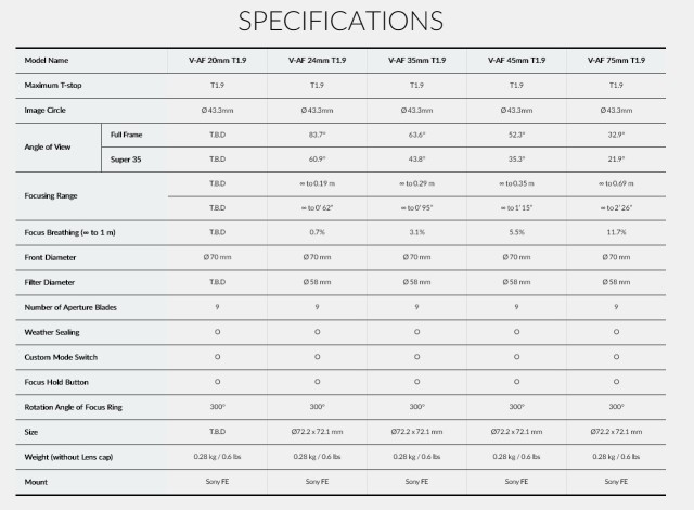 The Samyang V-AF series increases compatibility with gimbals and drones by applying the unified form factors with its 5 different focal lengths (Ultra-Wide to Medium-tele). By providing a compact size of 73 X 70mm and a light-weight of less than 300g, there is no need to re-set the equipment when changing the lenses. The new V-AF series supports resolutions up to 8K in a small and lightweight form, which is well suited for use with handheld gimbals and drones, as well as for studios and location productions. All lenses within the new V-AF series are color-matched to avoid shifts when swapping lenses, and the 9 aperture blades allow for a natural-looking bokeh. 11/2022.