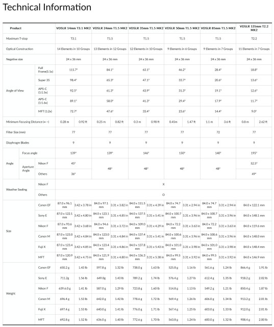The VDSLR MK2 set comprises 6 of the most-used focal lengths: 14mm T3.1, 24mm T1.5, 35mm T1.5, 50mm T1.5, 85mm T1.5 and 135mm T2.2. The range is highly versatile, available in 6 camera mounts: Canon EF, Sony E, Nikon F, Canon M, Fuji X and MFT. This new series inherits the outstanding image quality of the previous series: All 6 lenses have special glass element such as ASP or ED lens to reduce spherical and optical aberration, producing clear and vibrant images. The 14mm and the 50mm model also have a hybrid aspherical lens element to maintain compact size, without compromising performance.