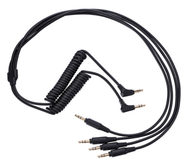 Designed for synchronized multi-device audio workflows, the Saramonic SR-C2019 is a high-performance coiled splitter cable that transforms the compact dual 3.5mm TRS outputs from 2.4 GHz or UHF wireless receivers into four independent 3.5mm TRS male feeds, perfect for feeding separate cameras, field recorders, or mixer channels without signal sharing or crosstalk. Its two right-angled input plugs ensure low-profile, strain-relieved connections to receivers mounted on camera hot shoes or rigs, while the four straight output connectors deliver full stereo or dual-mono signals—typically routing receiver 1 to outputs 1 & 2 (L/R) and receiver 2 to outputs 3 & 4—ideal for the Blink 500 Pro B8 quad system or similar dual-wireless configurations. The coiled section expands from 5.5 to 23.6 inches (14 to 60 cm), providing flexible reach without excess slack, and gold-plated contacts throughout guarantee maximum conductivity, minimal noise, and long-term durability in humid or high-movement environments. Lightweight and tangle-resistant, the SR-C2019 is a must-have for documentary crews, live streamers, and event producers needing reliable, plug-and-play multi-mic distribution on location.
