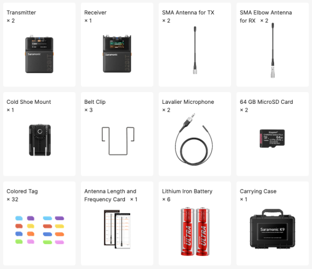 The Saramonic K9 is a dual-channel digital UHF wireless audio system designed for professional filmmaking. It features 32-bit float onboard recording, precise timecode synchronization, and a wide dynamic range for exceptional audio quality. The system includes rugged, miniature lavalier microphones and offers stable, interference-resistant performance.
