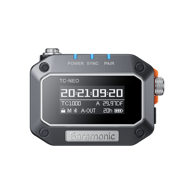 The Saramonic TC-NEO is a professional wireless timecode generator designed for precise and reliable sync. It features a high-precision TCXO with ±0.5 ppm accuracy for minimal drift, multiple sync methods including Bluetooth and 2.4 GHz, and a long 22-hour battery life for all-day shoots.