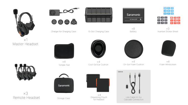The Saramonic WiTalk9 WT4S is a 9-person, hub-free, full-duplex wireless intercom system designed for seamless team communication. This kit includes one master and four remote headsets, offering hands-free operation and a range of up to 500m. Featuring ClearTalk™ noise cancellation and DECT technology, it ensures crystal-clear, secure, and reliable communication even in noisy environments.