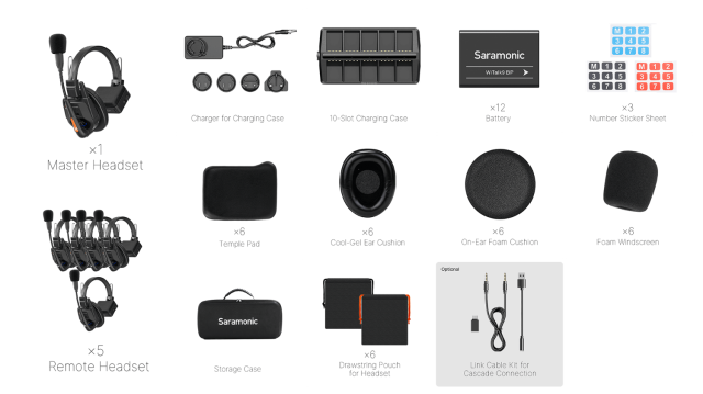 The Saramonic WiTalk9 WT6S is a 9-person, hub-free, full-duplex wireless intercom system designed for seamless team communication. This kit includes one master and four remote headsets, offering hands-free operation and a range of up to 500m. Featuring ClearTalk™ noise cancellation and DECT technology, it ensures crystal-clear, secure, and reliable communication even in noisy environments.