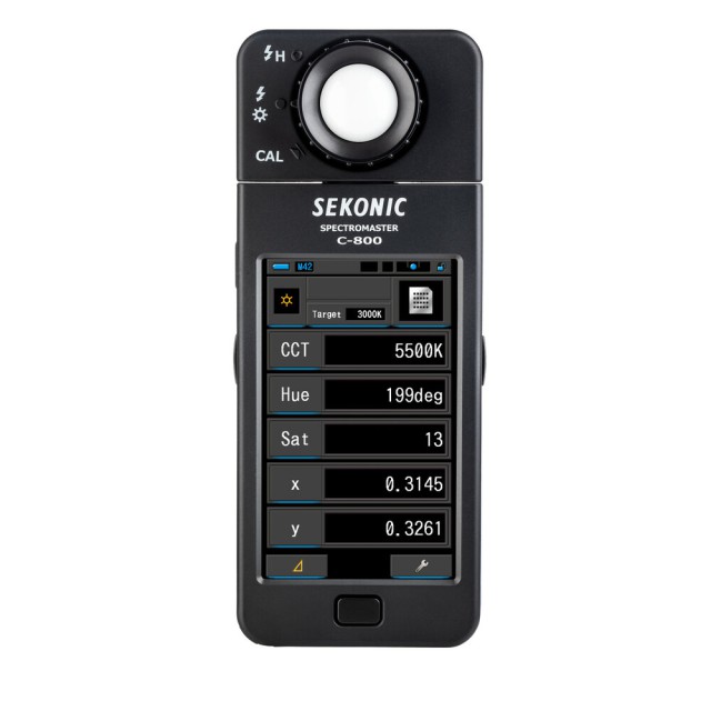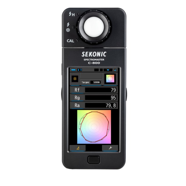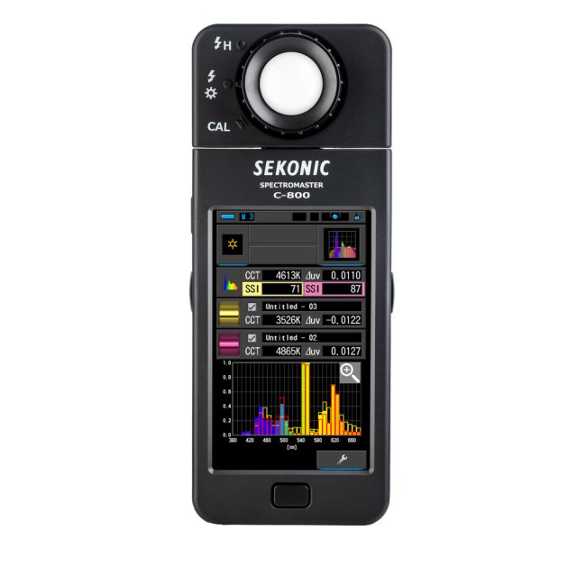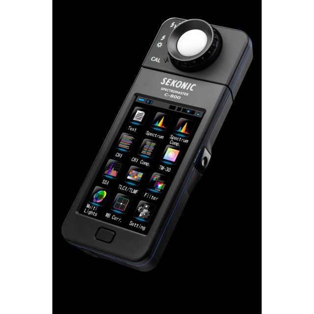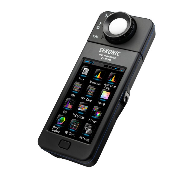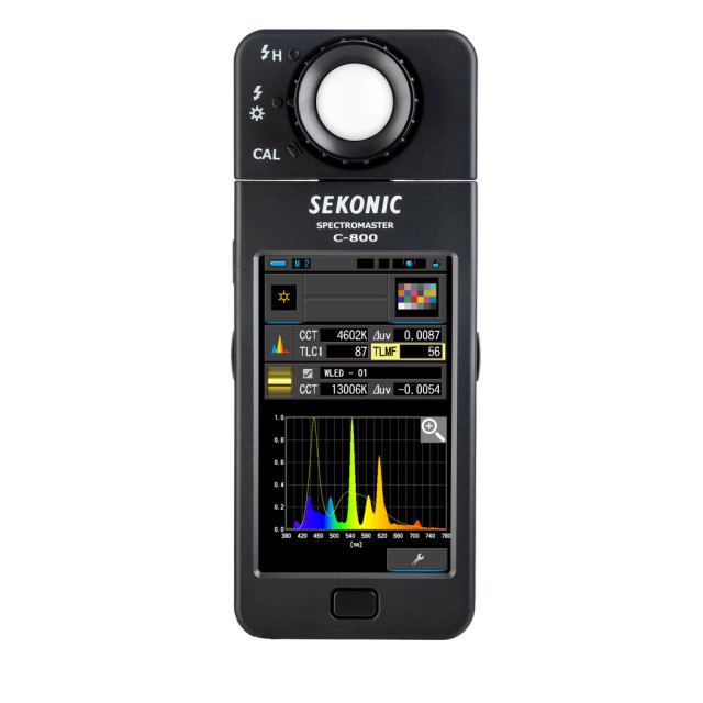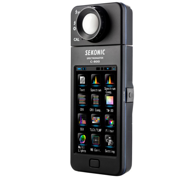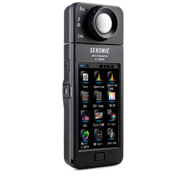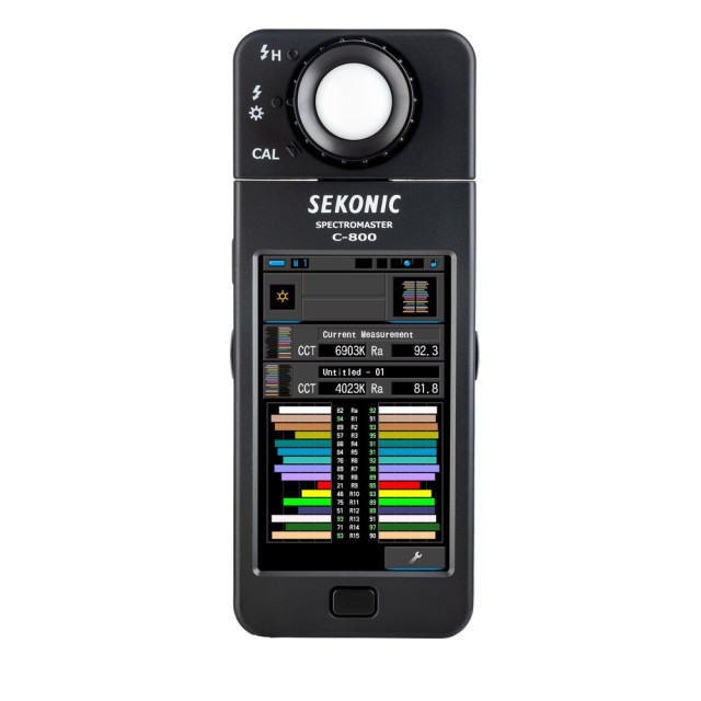 Intended for photographers, videographers, cinematographers, and gaffers, the C-800 SpectroMaster Color Meter from Sekonic is an advanced field meter capable of reading virtually all light sources whether they're LED, flash, incandescent, HMI, fluorescent, or in the natural light spectrum. Most importantly, it's a practical lighting tool that analyzes the light source using 11 different display modes on its 4.3" color touchscreen, indicating specifically what you need to do to achieve your desired effect. The meter's CMOS sensor enables measurement in increments as fine as 1nm and allows capture of color spikes in the light output - an especially valuable function when working with LED, HMI, fluorescent lighting, and mixed sources.