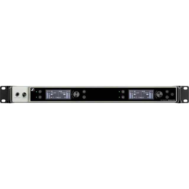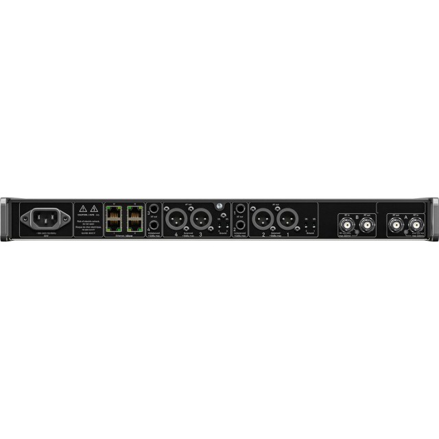 Four-channel 19” rack-mounted receiver with antennas and Dante audio networking interface.