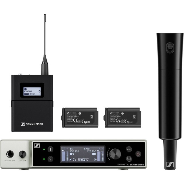 Includes the EW-DX EM 2 receiver, an EW-DX SK bodypack transmitter, an EW-DX SKM-S handheld transmitter with programmable mute switch, mic clamp, a power supply unit with country adapters, two BA 70 rechargeable batteries, two rod antennas, the GA 3 rack-mount kit, four rubber feet.