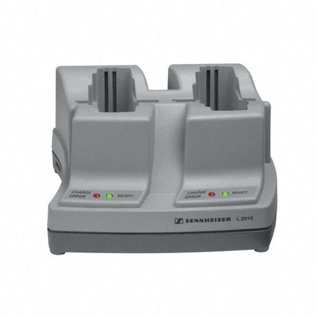The L 2015 quick-charging unit automatically recharges two Sennheiser BA 2015 batteries. The batteries are either inserted directly into the charger or remain in their bodypack transmitters/receivers of the evolution wireless G3 100, 300 and 500 Series, 2000 Series, Tourguide SK 2020-D and EK 1039. Several charging units can be daisy-chained and powered by one power supply unit.