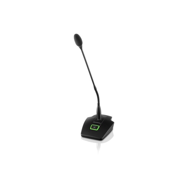 The SLDW TS133 is a wireless desktop stand with built-in SpeechLine transmitter. It is equipped with an XLR-3 connector and a backlit activation button. The power is provided by a Sennheiser Lithium-Ion battery, which is charged via USB port or wirelessly with Qi technology and will allow approximately 10 hours of operation.