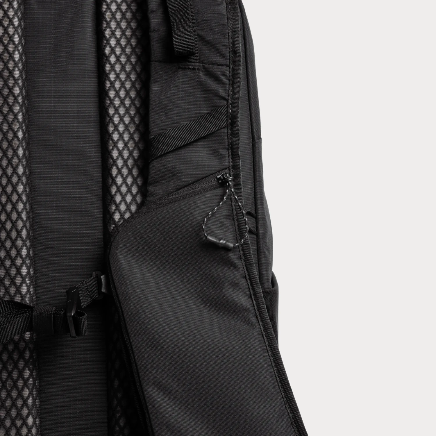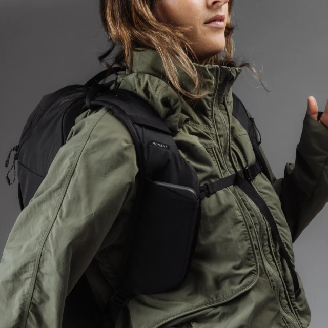 Never let your phone (or camera) run out of power. We've created a cable pass-through from the shoulder strap pocket to a dedicated battery pocket inside the backpack.
