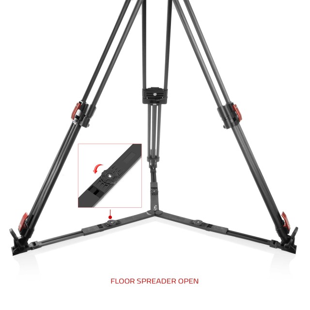 With a 100 mm bowl, the two stage carbon fiber legs are designed to welcome 100 mm tripod fluid heads (HD15), and have very solid aluminum clamps to secure your tripod at the right height. The legs are strong, stable and corrosion resistant, while being lightweight and easy to use. The system has a generous height range of 16 1/8 to 58 1/2” (41 to 148.5 cm) for low and high-angle shots when using the included floor spreader. The bottom of the legs have aluminum spikes when the spreader is removed to allow shooting on icy or slippery surfaces. The legs can be adjusted independently when on uneven terrain. (rocky mountain). The legs feature a 100mm bowl base for quick levelling of the head. A padded transport bag is included for safe transport.