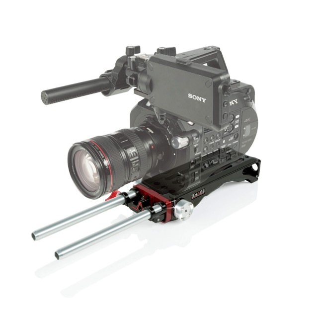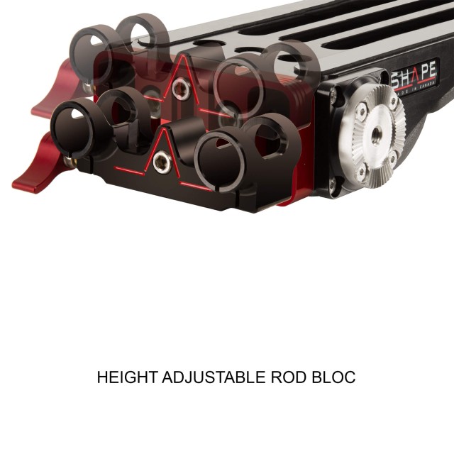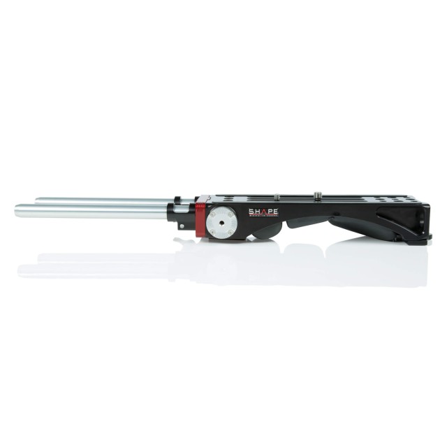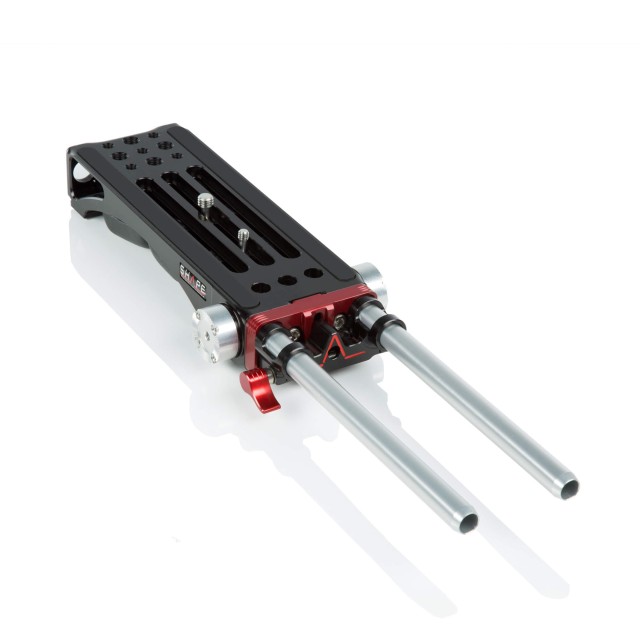 The shoulder pad secures on by touch fasteners. The tripod mount threads are located underneath the shoulder pad. One pair of 15 mm 8″ rods are included for the front. For attaching a matte-box and other accessories, the rod adapter can be adjusted vertically if you remove the screw holding it in position. This baseplate also supports optional SHAPE 15 mm Studio and 19 mm Studio adapters in place of the included one. The baseplate features three camera mount slots, all supporting 1/4″-20 and 3/8″-16 screws. The off-center slots allow you to mount your camera offset if you use a 15 mm Studio Adapter. Multiple 1/4″-20 and 3/8″-16 mounting threads are peppered behind the three slots for attaching articulating arms and other accessories. Two 1/4″-20 and two 3/8″-16 camera mount screws are included.