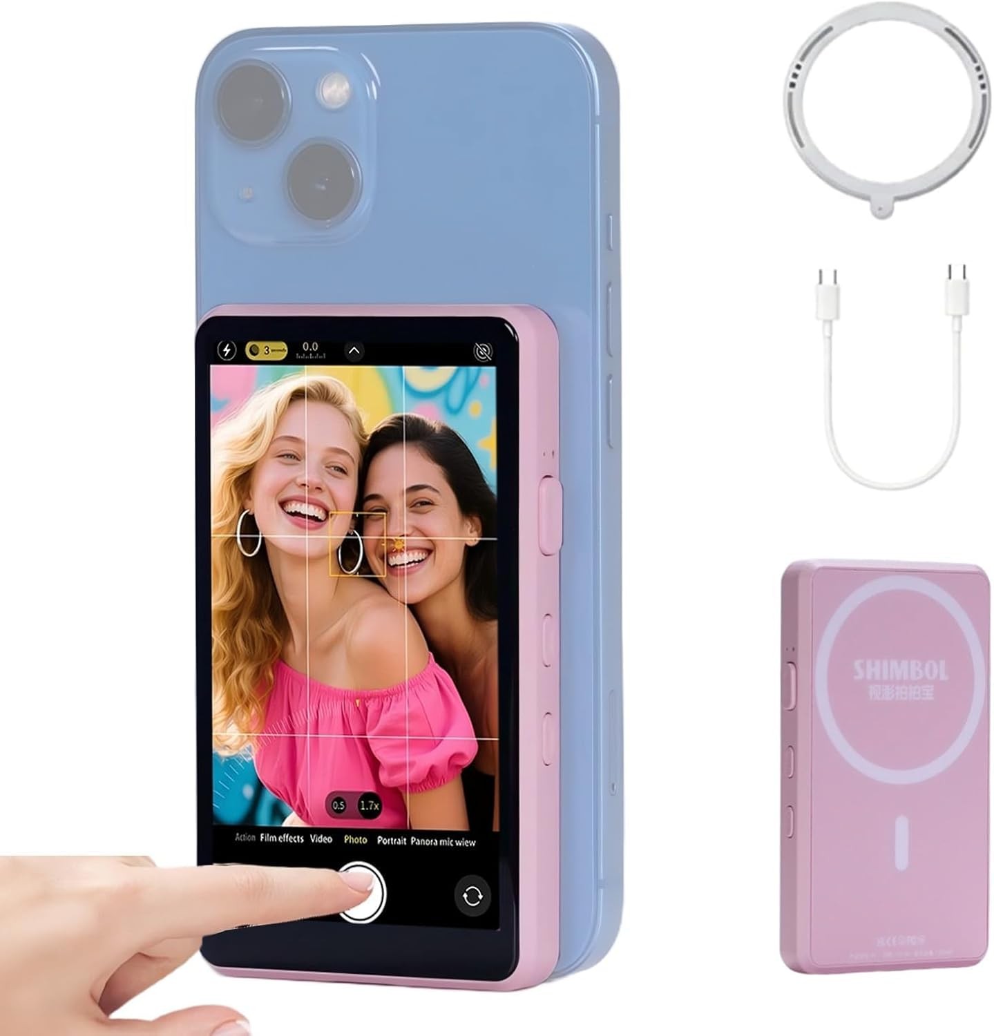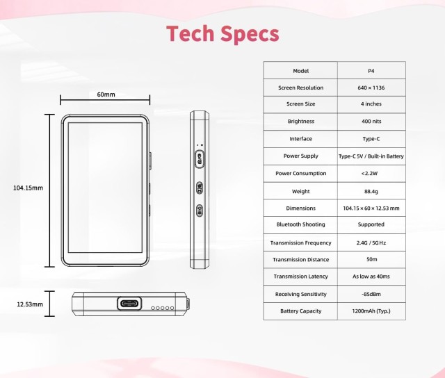 The Shimbol P4 Pink is a compact 4" wireless smart control screen that lets you operate your smartphone remotely with near-zero latency. Featuring a 640 × 1136 multi-touch display, Bluetooth 5.0 connectivity, and wide Android/iOS compatibility, it’s ideal for vloggers, creators, and remote shooting setups.