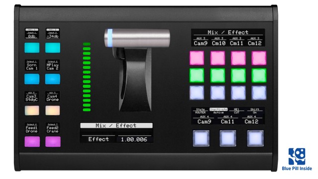 The surface features 15 NKK buttons, 8 four-way programmable buttons with individual OLED displays, and multiple large OLED screens that provide real-time feedback for dynamic control during live operations. A precision T-bar with RGB LED feedback allows smooth transitions and fade control, making it ideal for live switching tasks in broadcast studios and event production.