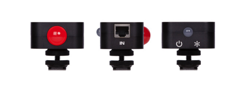 Connectivity is handled via two RJ45 ports, allowing daisy-chaining with other tally lights and integration with the Tally Box system for centralized control. The compact form factor and integrated hot shoe mount make it easy to attach directly to cameras or rigs, ensuring visibility without adding bulk.