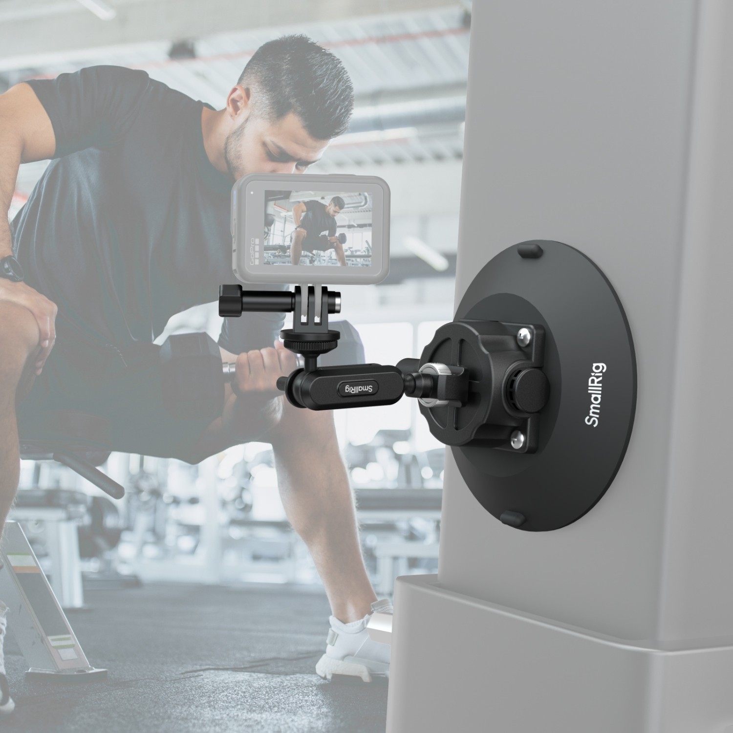 The magic arm connects to the suction cup via a screw and accommodates action cameras or can be paired with SmallRig accessories (ID 5135, 5000) for compatibility with devices like the DJI Osmo Action 5 Pro and Insta360 Ace Pro 2. This setup is ideal for in-vehicle filming or indoor time-lapse photography.
