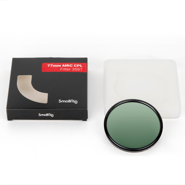 SmallRig 77mm MRC CPL Filter 3587 is a double-sided multi-film polarizer designed to eliminate reflections from non-metallic surfaces such as water and glass, increase saturation while retaining vivid color of photographs or videos. Made from high clarity, high transmission B270 optical glass, the filter is precisely ground and polished for use with lenses of various focal length without compromising image sharpness. It is coated on both sides with 18 films to increase light transmission and reduce reflections. These coatings are mildewproof and water-resistant, toughened to prevent stain and easy to clean and care for, making for a part of everyone's gear bag. The filter tray, made from aircraft-grade aluminium alloy, is CNC machined, laser engraved and anodized for long-term use without wear and tear. The filter is compatible with lenses of 77mm in diameter.