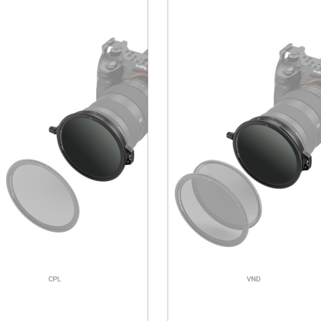 SmallRig 95mm CPL-VND Filter Kit with Rod Clamp 3864 is a specialized two-in-one CPL-VND filter system. The two CPLs can be either used separately or magnetically combined to become a VND filter of 1-8 stop stepless and adjustable dimming. The whole filter system can attach SmallRig 95mm Matte Box 3645 and VND Filter Kit 3651 via magnet at the same time to realize the function of VND adjustment when paired with a matte box.