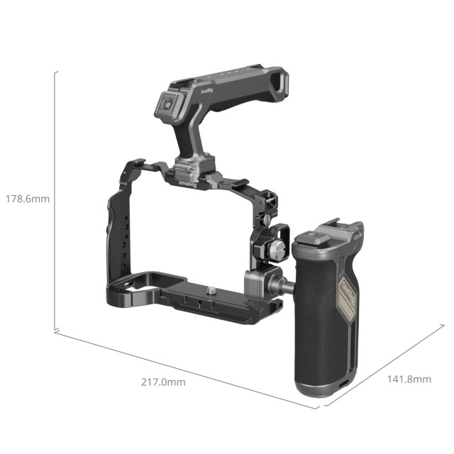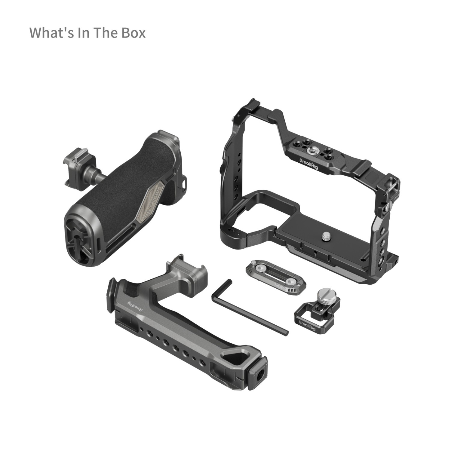 This kit includes a cage, HDMI cable clamp, top and side handles, and a NATO rail.