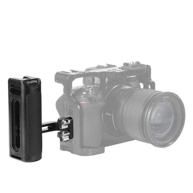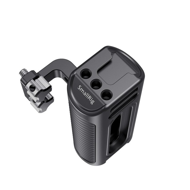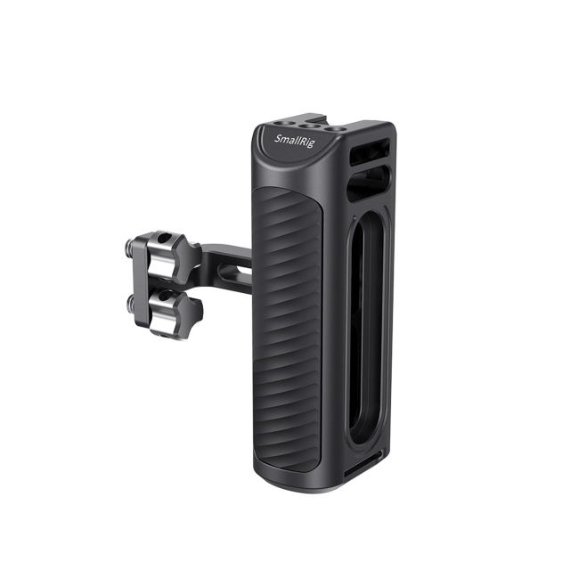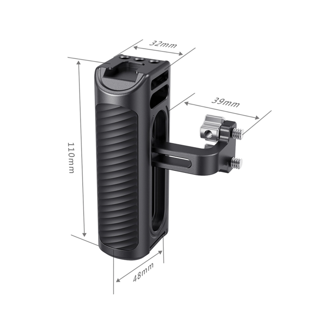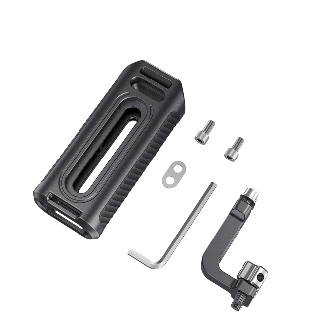 SmallRig Aluminum Universal Side Handle HSS2425 is designed to provide a comfortable handheld shooting for cameramen. A built-in hex on the bottom can be used to adjust the handle up and down based on your needs. If you want to use the handle on the other side of the cage, use the hex to take off the connection metal part of handle and change the direction. The handle can be mounted to the left or right side of camera cage with two 1/4”-20 screws. It comes with one cold shoe and three 1/4”-20 thread holes allow for mounting accessories. It weighs 220g only and features an aluminum body with anti-slip silicone gel coverings to provide a comfortable and lightweight handheld shooting. Also this handle can be used with a hand strap for more security.