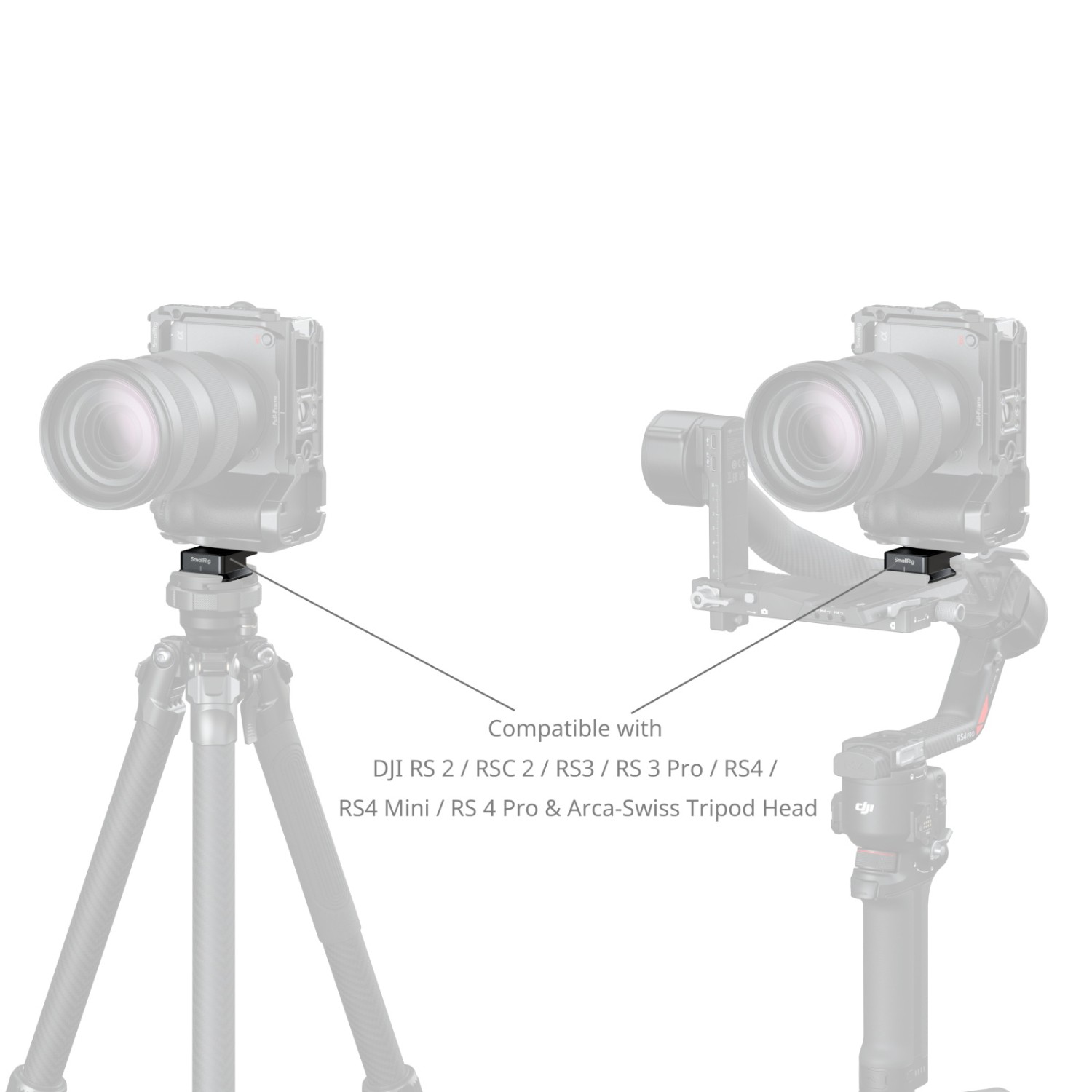 The plate is compatible with Arca-type tripods and DJI RS series stabilizers (including RS 2, RSC 2, RS 3, RS 3 Pro, RS 4, RS 4 Pro, and RS 4 Mini), facilitating efficient transitions between tripod and gimbal setups to enhance workflow. A dual-head wrench is included for easy installation and removal.