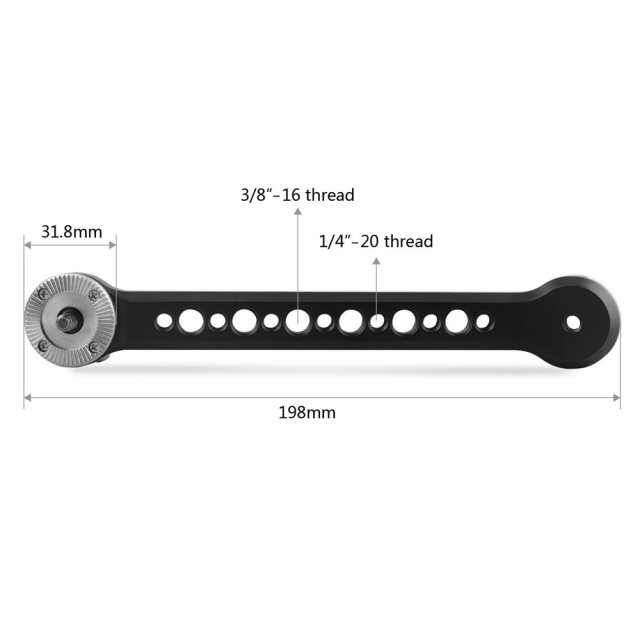 SmallRig Arri Extension Arm 1807 provides 198mm of extension for Arri-standard rosette handgrips and other gears with Arri style rosette mount, such as RED, URSA Mini, Sony FS7 or other. It features an M6 male thread on one end and an M6 female thread on the other end. The arm itself has multiple 3/8"-16 and 1/4"-20 threaded holes for attaching accessories.