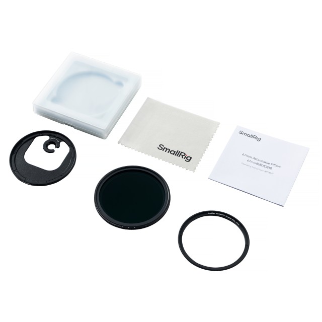 SmallRig Attachable VND Filter Kit ND2-ND32 (1-5 Stop) with M-mount Filter Adapter 67mm 4724 Through the VND filter with adjustable exposure reduction, users can flexibly utilize it in video shooting, providing them with reasonable exposure parameter settings and delivering more professional video footage. The multi-coated optical glass offers reliable optical quality, ensuring that the captured images are free from vignetting. The magnetic attachment system provides users with a fast and efficient experience for installing and replacing filters. The set includes an M-mount adapter ring for direct integration with the M-mount backplane on iPhone series cages. Equipped with the threaded adapter ring, the filter can be mounted on a 67mm camera lens, providing a convenient magnetic filter installation experience for camera lenses.