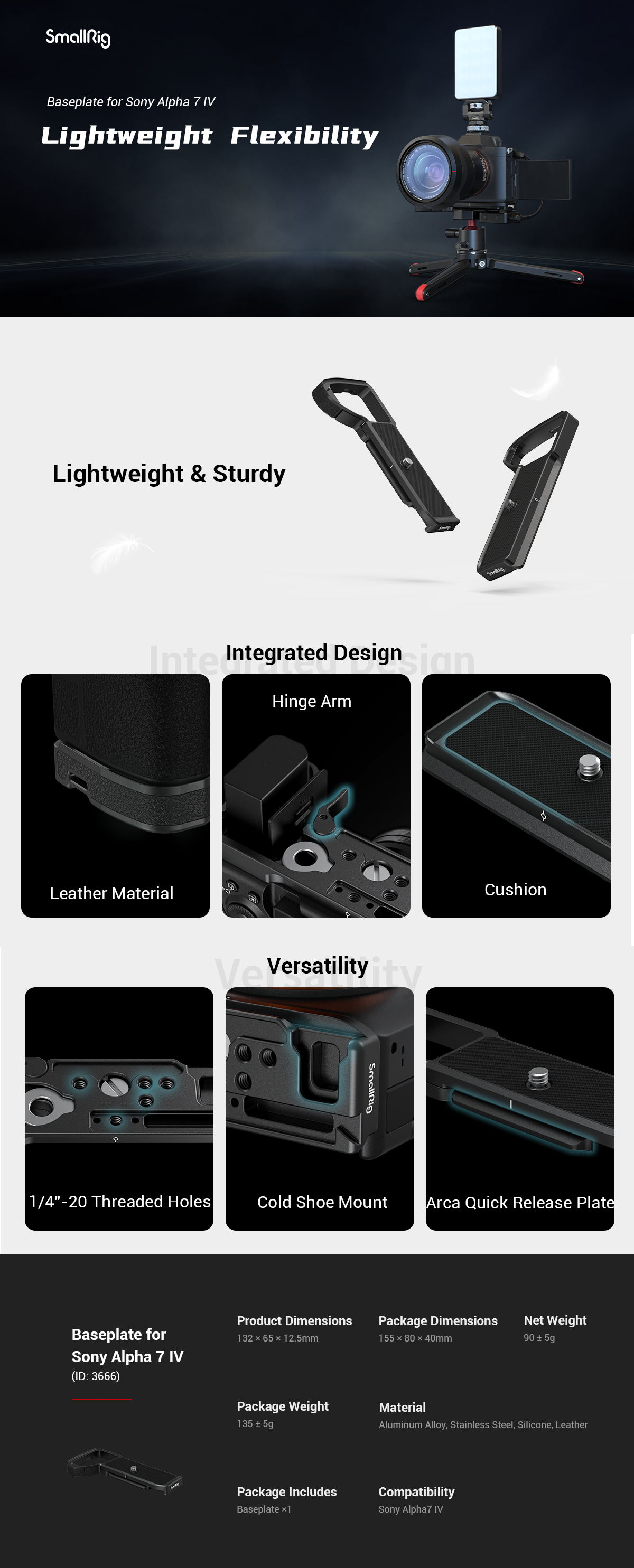 The SmallRig Base Plate for Sony Alpha 7 V / 7R V / Alpha 7 IV 3666 aims to improve the holding experience and enable tripod and handheld shooting while protecting the bottom of the camera. It attaches to the bottom of the camera with a 1/4"-20 screw and positioning pin and features a built-in silicone pad to prevent scratches and twisting. The battery door has a spindle key that adapts to the curve of the camera and leaves room for the little finger for a comfortable grip; embedded in selected genuine leather in the base plate, it integrates into the camera body. 1/4"-20 threaded holes and cold shoe mounts on the bottom support mini tripods and microphones. In addition, the Arca-compatible base plate allows for quick switching between tripod, stabilizer (DJI RS 2 / RSC 2 / RS 3 / RS 3 Pro), and handheld shooting. An accessible built-in magnetic key makes disassembly and assembly easy.