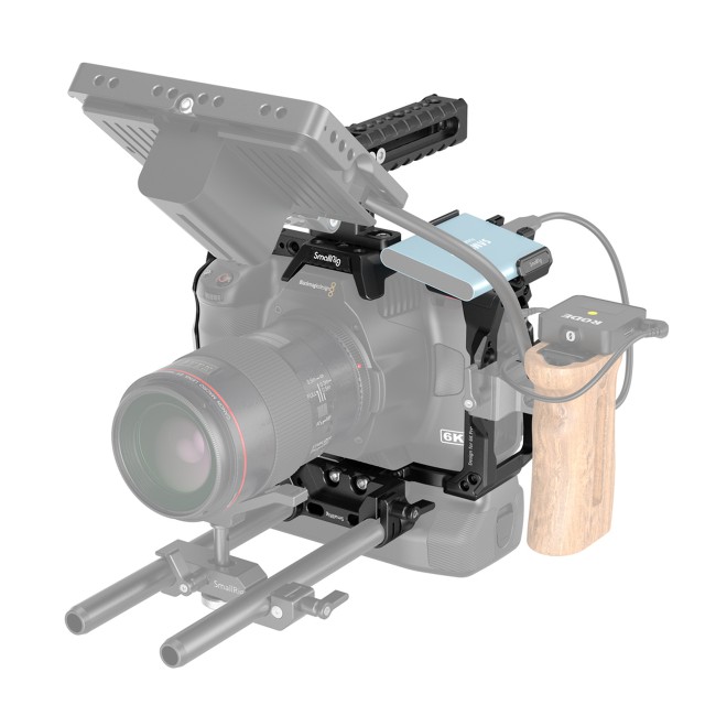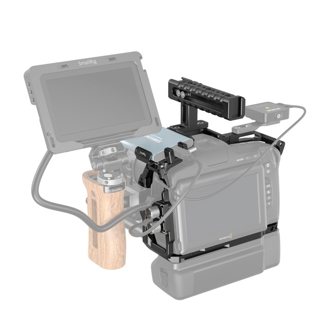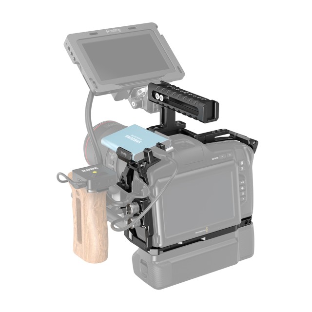 SmallRig Basic Kit 3583 is made of aluminum alloy, sturdy and durable. It works with a removable Pogo Pin and can connect directly to Blackmagic Pocket Camera Battery Grip for power supply and comes with multiple 1/4"-20 threaded holes to support other accessories. The kit also includes Top Handle 1984 for handheld shooting and lightweight dual rod clamp, which suits 15mm dual rod, for mounting Follow Focus 3010 and Matte Box 2660 or Mini Matte Box 3196. The SSD mount is of cold shoe design, allowing quick assembly and disassembly. The thumb cable clamp help to clamp HDMI and USB-C cables to prevent signal interruptions caused by cable loss during filming.