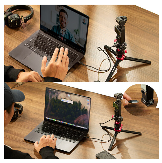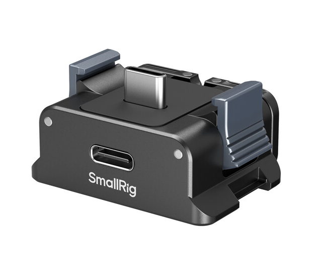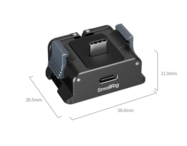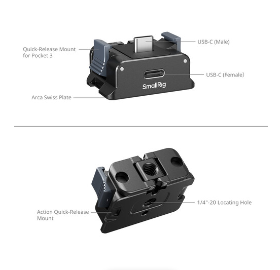 Mount and power your DJI Osmo Pocket 3 with the SmallRig Battery Adapter Plate, a lightweight 1.2 oz aluminum base featuring a folding 2-prong clamp, integrated Arca-type quick-release plate, 1/4"-20 anti-twist thread, and pass-through USB-C charging (male-to-female) with silicone padding for scratch-free grip and stable handheld or tripod operation.